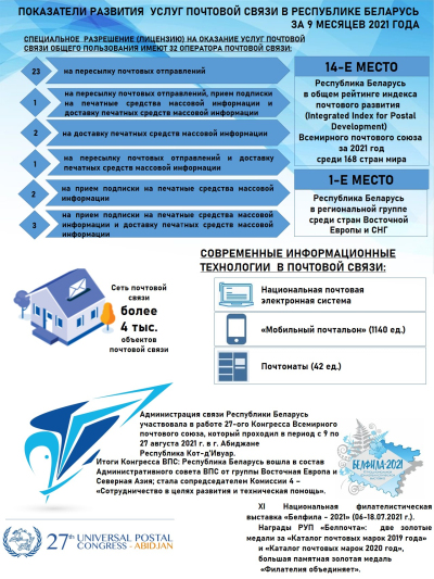 С 9 по 27 августа 2021 года в Абиджане (Кот-д'Ивуар) состоялся 27-й Конгресс Всемирного почтового союза. Впервые Конгресс ВПС проходил в гибридном формате.