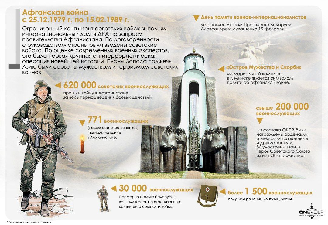 37 лет назад, 15 февраля 1989 года, был завершен вывод советских войн из Афганистана. Многие наши военные совершили подвиги на той войне, некоторые получили посмертные награды, кому-то удалось выжить, но какой ценой... Война – это всегда боль и потери. В суверенной Беларуси ежегодно с 1998 года чтут память соотечественников. Эта дата – напоминание о страшных последствиях военных действий и о том, как важно не допускать повторений событий.